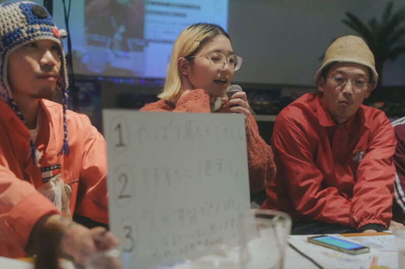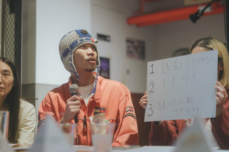 さっきかんた君も言ってたけど、夜遊びの文化は、僕はもう朝まであった方がいいなと思ってて。自分も朝まで飲み続けるんですけど、いつも。だけど、若者が朝まで遊べる場所がないっていうんで、そういう場所があったらいいなと。なので、銭湯とクラブがあったらいいなと(笑)。あとは、ローカルの子たちの力をちゃんとフックアップしてあげて、仕事としてつなげていくことが大事かな、と。才能が街の中で循環する仕組みができたらいいなと思っています。